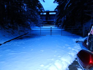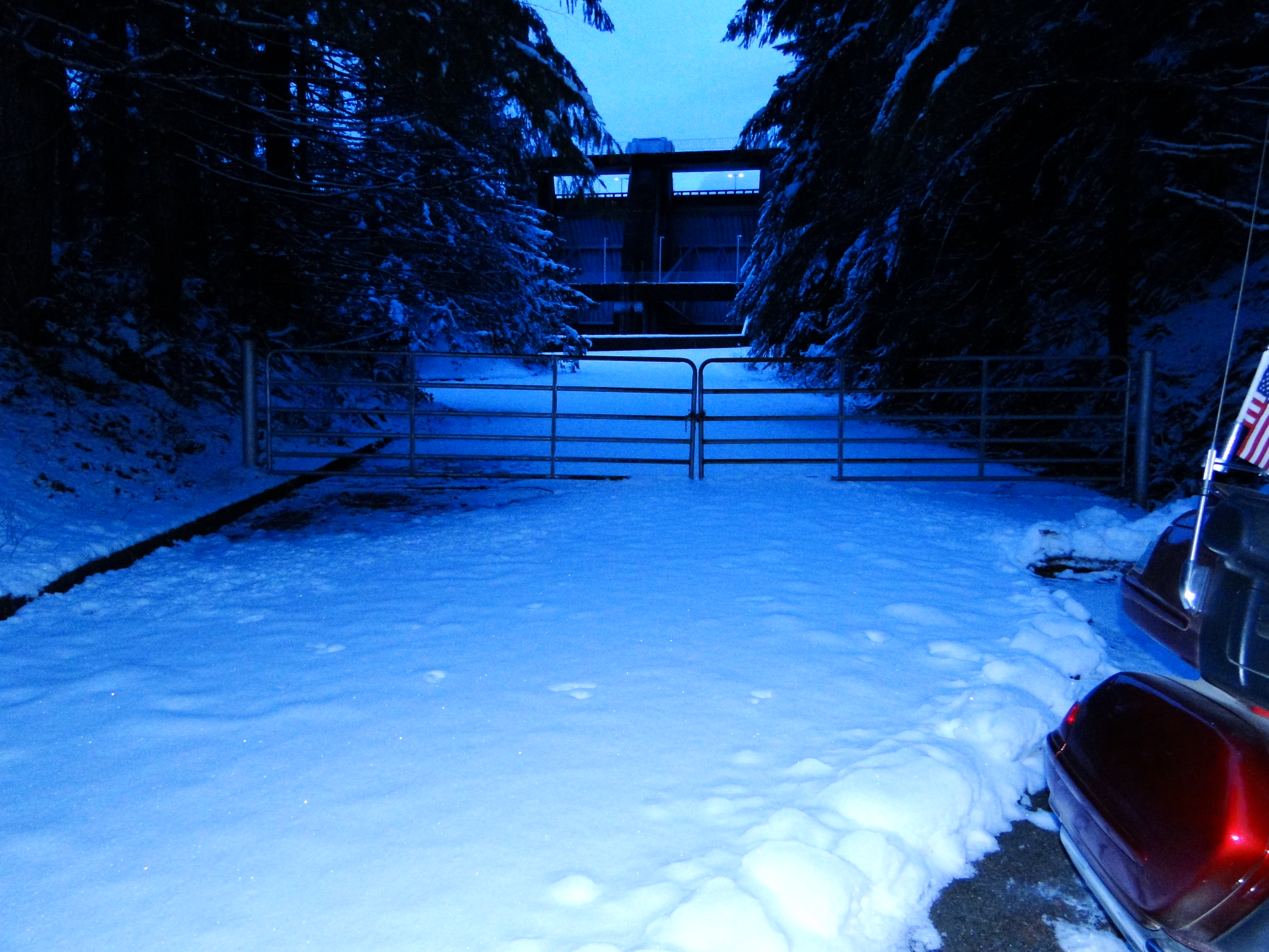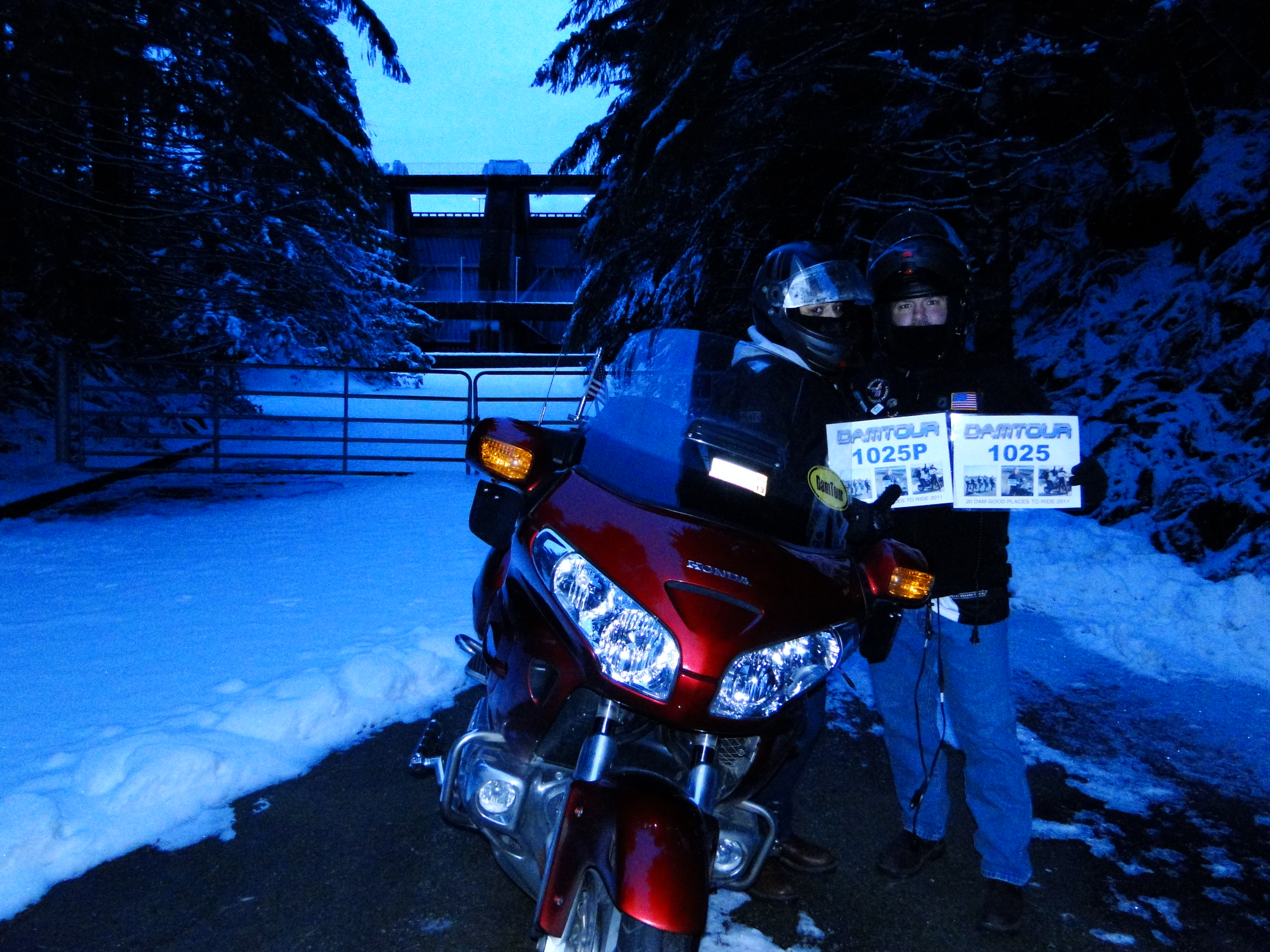 We’ve arrived! And perfect timing as the sky has just begun to lighten. There was a gate closed against close-up access but we had a clear view of the dam just a short distance beyond it. We pulled in as close as we could, set up the tripod and got to picture-taking. Angela stayed close to the bike so she could remain plugged in to her heat source while I nearly lost a hand to frostbite setting up the camera and re-taking shots. After getting the official placard pictures, we dodged around the gatepost and snuck our selves a closer up view. Only a small trickle of water was passing through an outlet valve but the viewpoint gives you a real close-up look at the dam. Though it’s only the first dam of the season, Angela liked it quite a bit and thinks it might end up being one of her favorites, tucked into the woods like it is. After a little play in the undisturbed powder behind the gate we walked back onto the right side of the law and around the corner onto the bridge. Looking over the rail we found that the stream below had a good portion frozen over. A few more pictures and it was time for the return trip. Now that it was lighter and I knew the road conditions, the ride back was less tense.