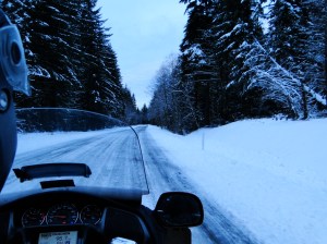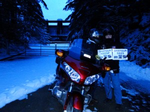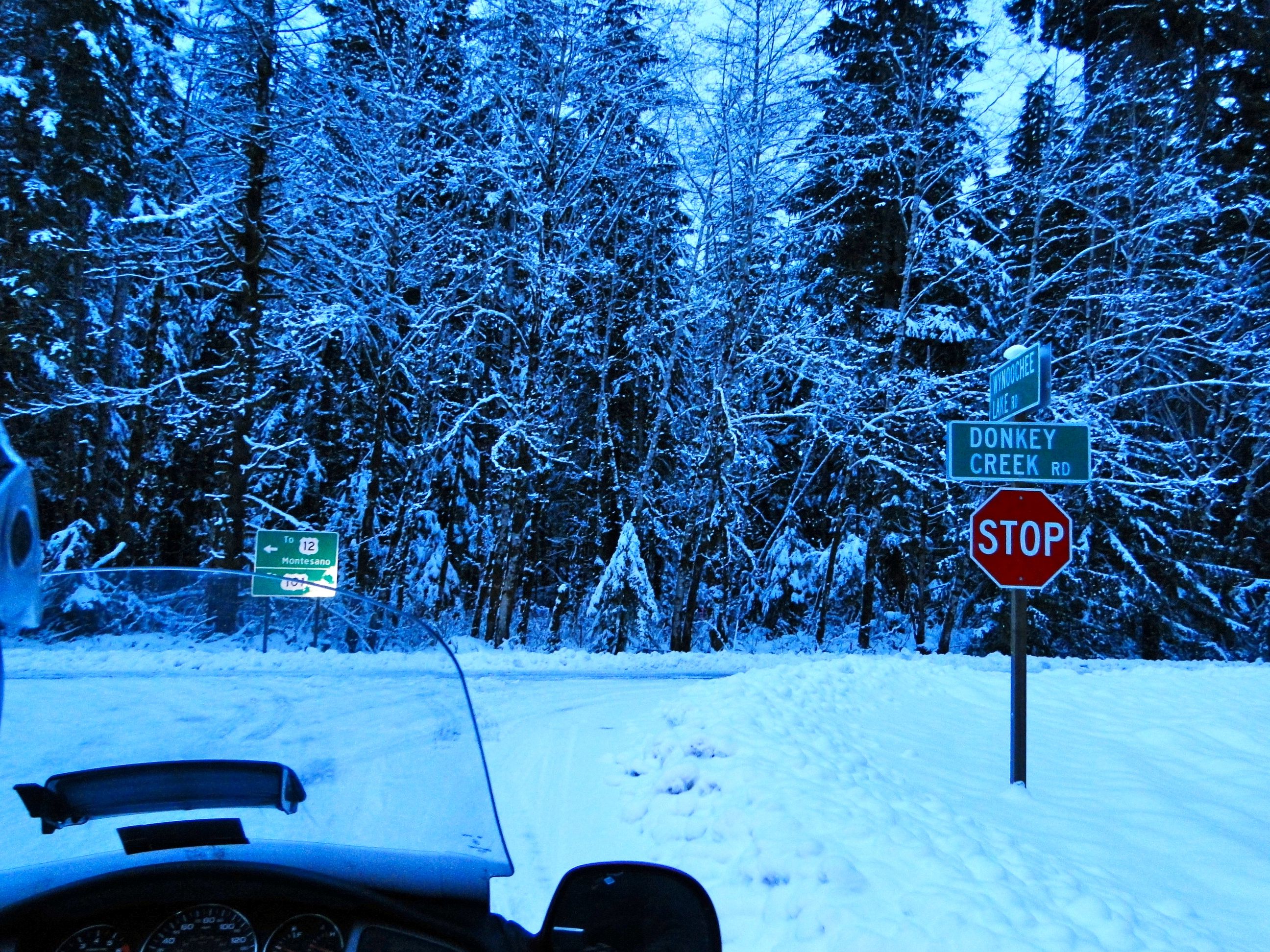 After securing some cookies for the troops we then drove on to take our picture in front of Imperium Renewables in the Port of Grays Harbor. After a quick stop for directions, we found the place, took our photo-proof and scooted down the road to Ocean Shores for a picture in front of the sign of the Quinault Marina and RV Park, a bonus location for our Wing Washington challenge. We then took a brief ride onto the beach figuring since we’re in Ocean Shores we might as well check out of the ocean while we’re here. Plus, the temperature was now a balmy 34, perfect for a day at the beach! After refueling us with some hot chocolate and the bike with some gas, we began the “easy” return ride home, expecting to be home within a couple of hours. It was not to be.