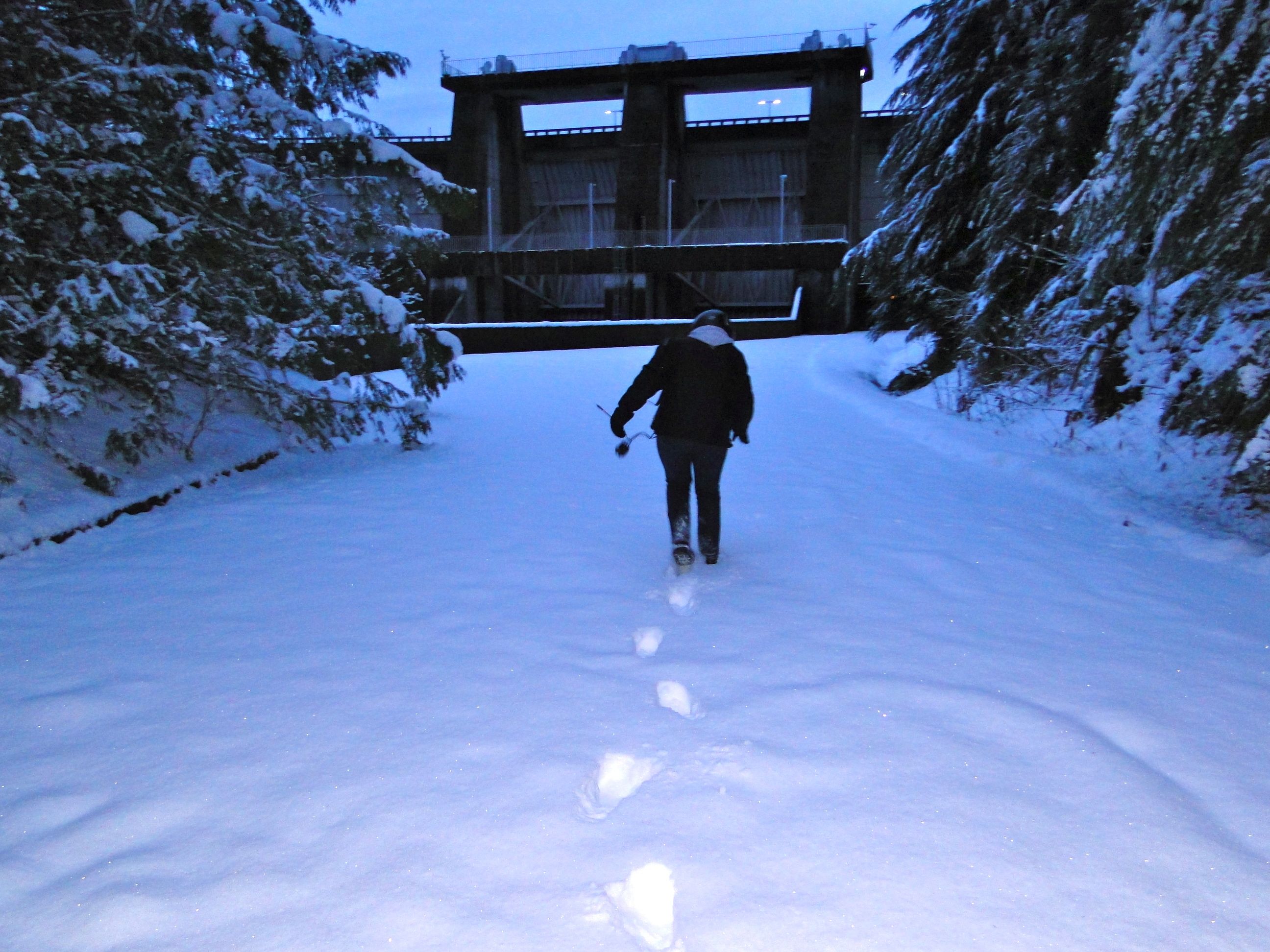 Originally we had been planning to take Cougar Smith Road out of Shelton to the dam, but with the road conditions, we decided to use a route we thought might be in better shape, traveling south on I-5 then west along 101, 8 and 12 to Montesano where we turned north onto Wynoochee Road. Although there is an 8-mile section with no shoulder and a few areas with rough road, there are signs warning of both and I had no problem with either. The first 20 miles of this 31 mile section, the pavement was bare and dry though I was cautious in treed areas where the sun hadn’t yet melted all the snow/ice. When we reached the National Forest sign, there was smooth, new tarmac, though again I had to watch for shaded areas as there were some slick spots. Because it leads to a recreation area the roads are fairly well cared for. But all this leads us to the last 3 miles! We camearound a bend and suddenly the road was no longer bare and dry but instead turned ugly, covered with snow and ice, and we nearly turned back. After a little surveying, I decided to test it out a bit further and was glad I did. There were tricky areas but we took it slow and, since I had the road to myself, I drove the bare spots regardless of which lane they were in.