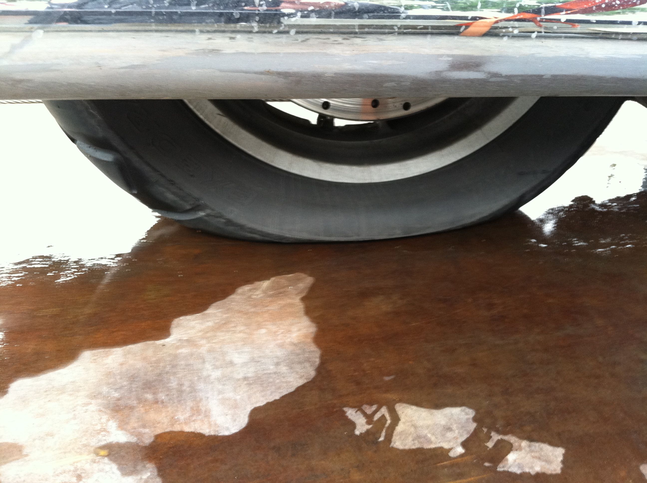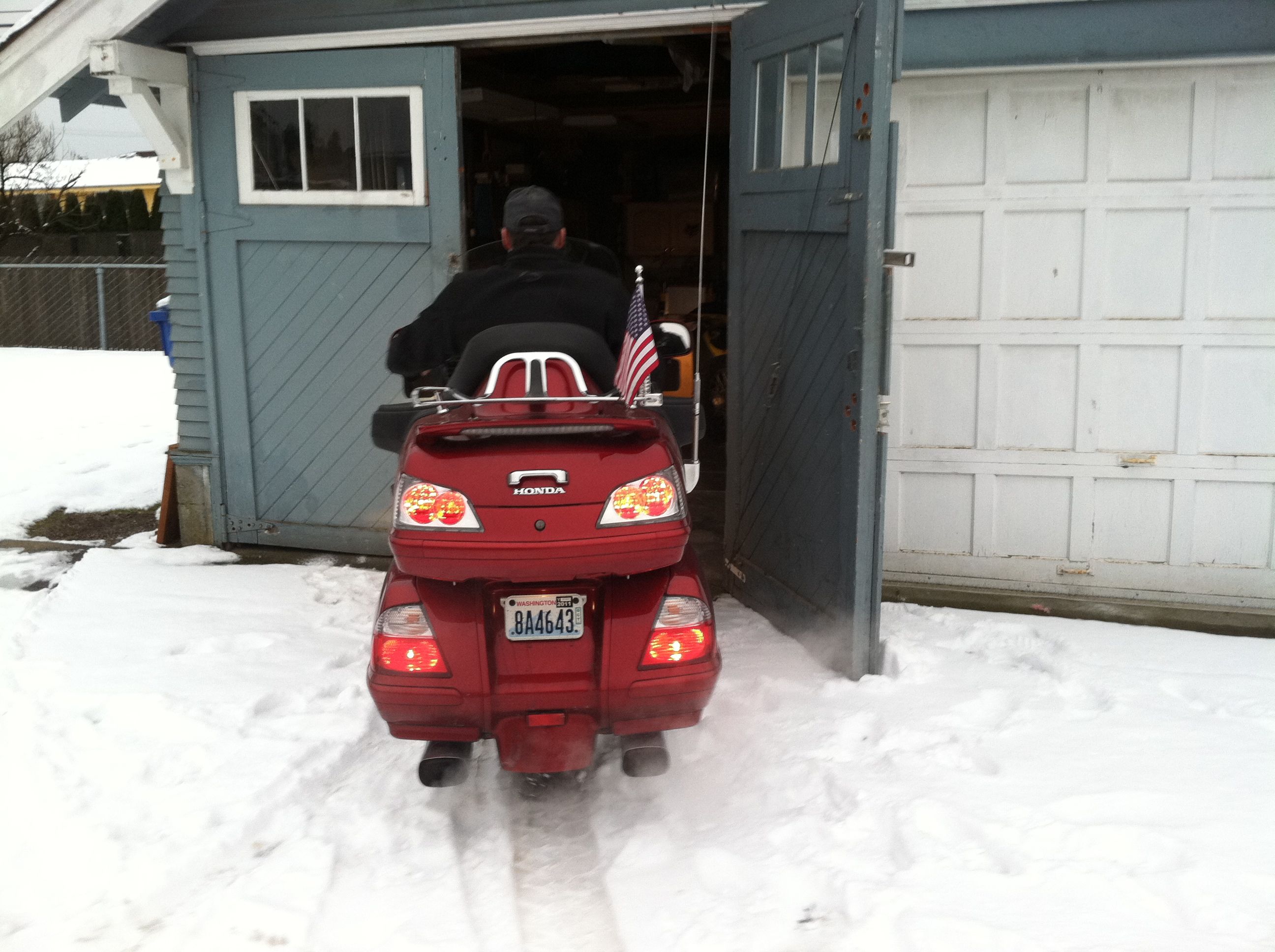 Shortly after a stop in Aberdeen to quick rinse some of the salt and road grime off the bike, I pulled into the Elma rest stop to use the facilities, check out the bike which had begun acting “squirrely”, and try to figure out why Angela’s Gerbing gloves are suddenly not working. Finding the back tire low I decided to head into McCleary to re-inflate then drive to the Tumwater Jack-in-the-Box for lunch and another pressure check. After lunch I checked to see if air put in tire in McCleary is holding. Turns out it’s not. The 50 lbs we left McCleary with has been reduced to…zero. AAA to the rescue. Only a 25 minute wait and they were onsite to load the bike and get us home.