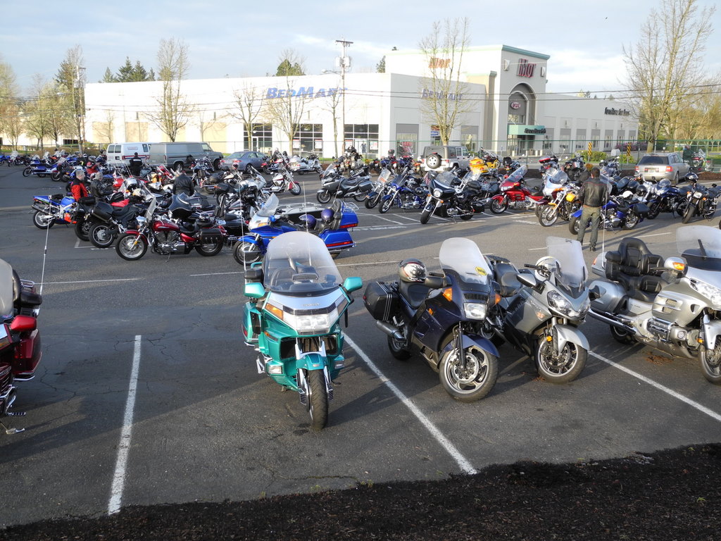 The ride began, and ended, with an onsite poker chip draw. We each pulled a numbered chip from two cans and had our numbers recorded on our answer card for a chance at a high- or low-total award at the end of the ride. As Angela and I handed our chips over to the attendants to verify, I noticed the gentleman I was handing them to had 2010 DT pins on his riding jacket. I looked at Angela and said “look, Honey, another DT rider”. I showed this gentleman our pins and proudly announced to him “yeah, we were the ones who snagged the first dam of the season”. He instantly smiled and put his hand out and said “Hi, I’m DamDan”. We were very familiar with the name from the DamTour’s rider’s forum and were pleased to meet him. We joked and discussed a little about our Wynoochee dam adventure and then Dan explained his adventure with that dam. I think everybody is in agreement – Angela and I might be a little certifiable, but first dam bragging rights were totally worth it. And Dan seconded the idea of one rider who had elegantly commented …”Dude, even your wife has bigger balls than me.” After talking with Dan for a few minutes it was time to mount up for the ride. It was nice to see that all types of riders and their bikes were participating – new, old, Harley’s, Gold Wings, dual sports, crotch rockets and even a couple of trikes.