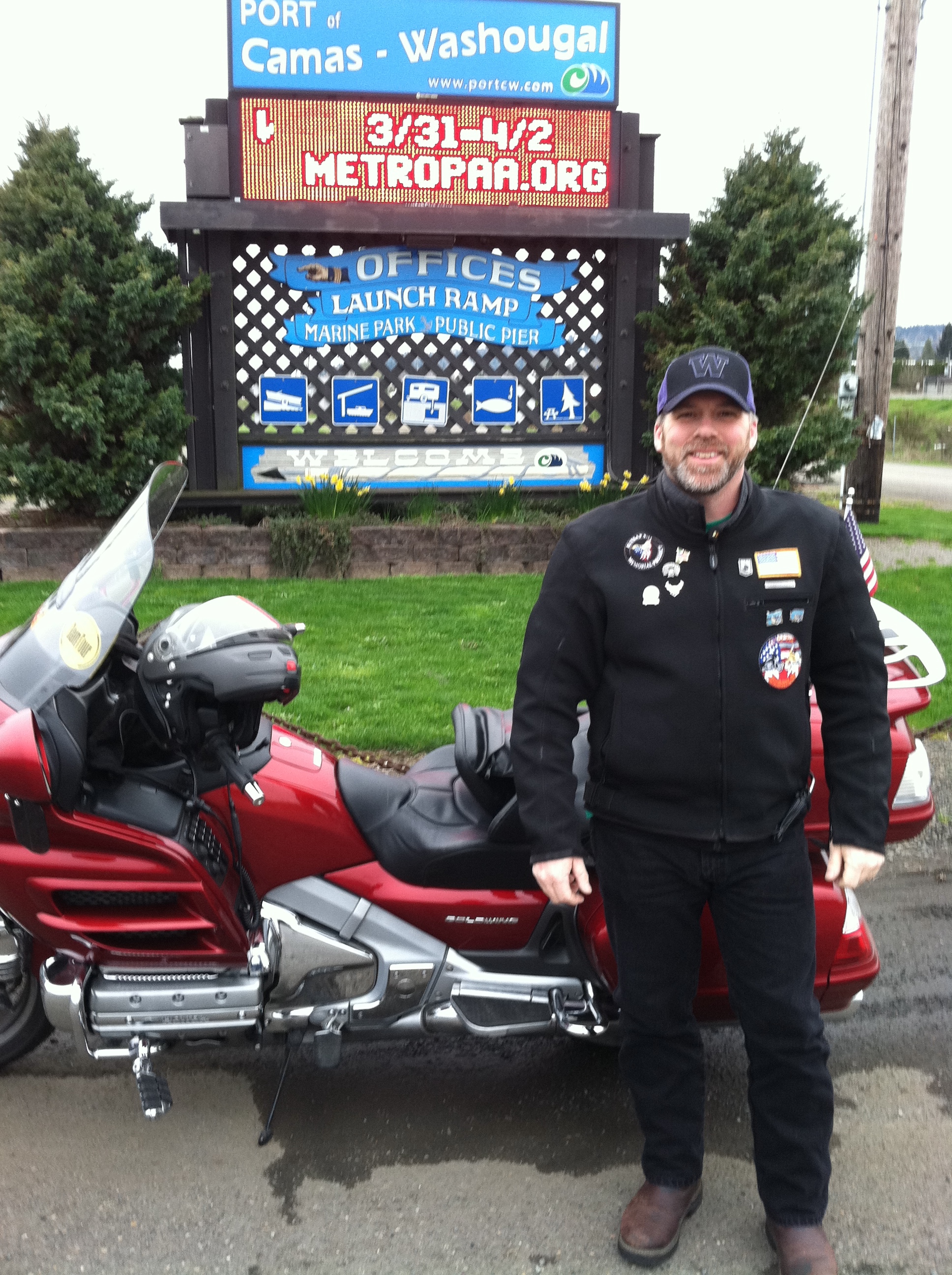 During lunch we had discussed that there was a Wing Washington bonus location kind-of on the way home, just a little more East than we needed to be. As we headed out of Portland, I checked the GPS and found the bonus location was just 14 miles away, and, hell, we had already ridden around 400 miles, so what’s another 14 we asked ourselves. The location – the Camas/Washougal Marina – was located just over the Washington border so after we crossed over into Washington, we turned right and off we went to get our picture. It was only a 15 minute ride to our destination and we quickly located the proper spot to take the necessary picture.