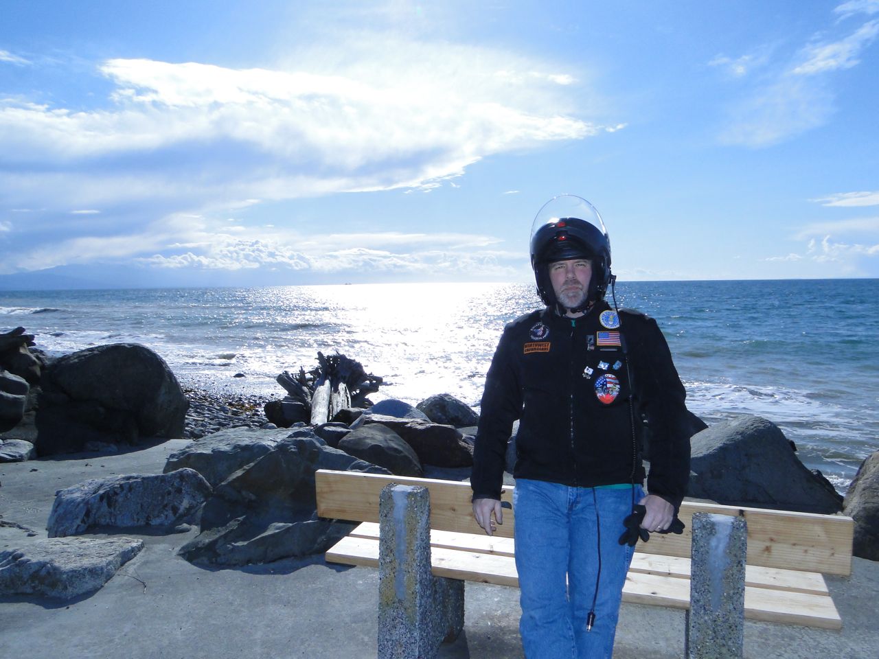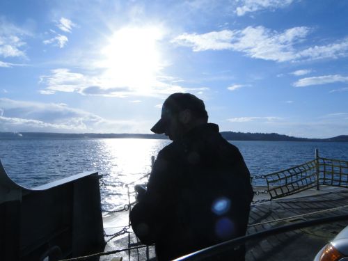 Being a motorcycle we got to load first… you really have to love that about our ferry system, don’t ya? Unfair to others but satisfying for us. We boarded, parked and headed upstairs to check out the boat which is fairly new, commissioned just a year ago. We went out on deck where we were afforded an expansive view of the sound but also a view of the bike below as the ferry began to rock as it got underway. A little nervous, we headed back down to stand guard against the bike toppling. Our worries were unfounded as she (yes, our bike is a she) stayed completely firm on her stand. It was a beautiful day and we enjoyed the views and the wind in our hair. Usually we have full face helmets encompassing our heads.