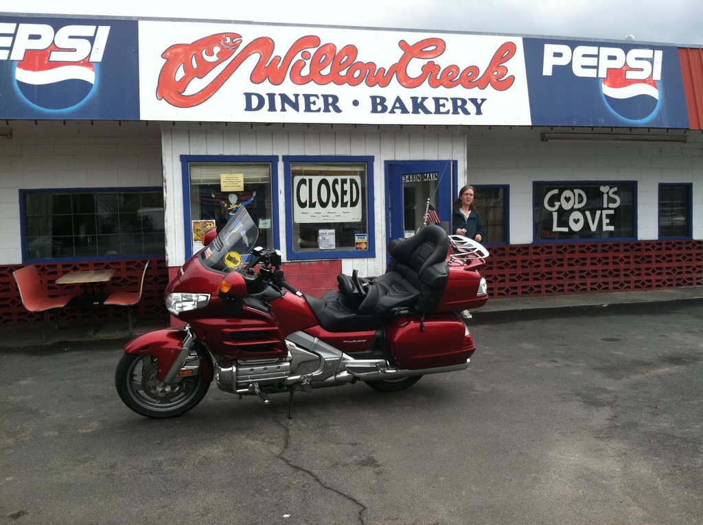 Back on route, we stopped in the town of Heppner at the GT site, Willow Creek Café. We started to take our pictures in front of it, as they were closed and a photo is an acceptable alternate to a stamp in your passport, when the door opened and the owner came out with her stamp. They’re closed on Saturdays but she just happened to be in the store when we pulled up so she came out to give us an official stamp.