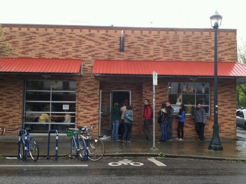 They have been featured on the Food Networks “Diner’s, Drive-in’s and Dive’s” and last year when we were in Portland we passed their other location and noted the line of people outside the door. We did our own time in the line and just as we ordered a table opened up which Angela quickly snagged (their rules, being a small establishment, clearly state you need to order before sitting). I got the “Reggie”