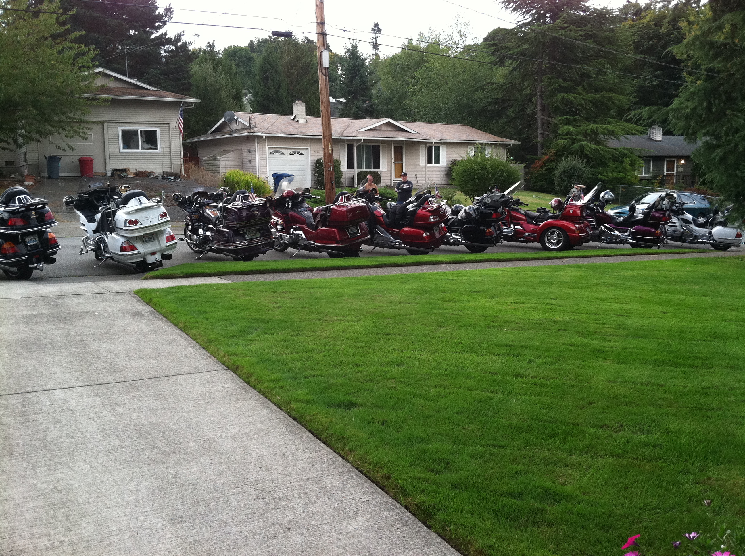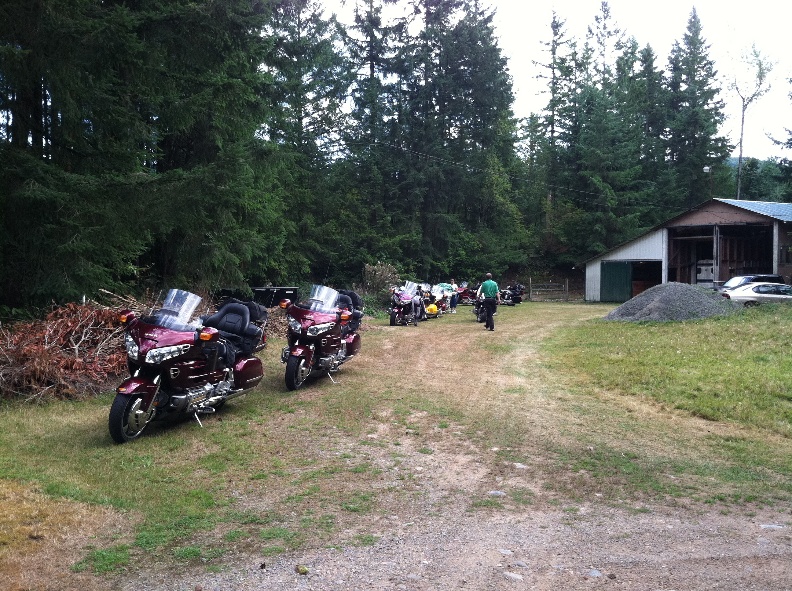 Just as we were preparing to leave Bud’s, Angela called me saying she was done with her training so I let her know we were headed for Ron and Margaret’s in Ravensdale for the main course and salads. Knowing the main course might take a little longer, I figured maybe we could somehow cross paths and she could continue the ride with the group. Wanting to meet up with the group but not having a GPS or a smart phone, Angela went back to her roots and called family. Following her mom’s directions from Parkland to Covington, she then contacted Grandma who grew up in Ravensdale. With the final directions, she headed off and before she knew it drove right through Ravensdale (which basically consists of about 5 buildings). Luckily, there was a bike race occurring in the area and Angela stopped to ask a police officer if she was on the right route for Ravensdale – he told her “do you remember seeing a post office and a little convenience store a few miles back?” As she nodded, the police officer responded, “That was Ravensdale.” Backtracking, she pulled over at the little store and waited, figuring the group would likely travel through this “main” intersection. Sure enough, she soon saw the group of Wings, which she described as an impressive sight to see. She pulled out and held up traffic (to a little discontent from a few other drivers,) so all the bikes could make the turn together, then fell in behind and followed us the rest of the way. Once at Ron and Margret’s the main course was served along with many tasty side dishes.