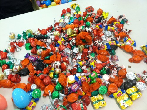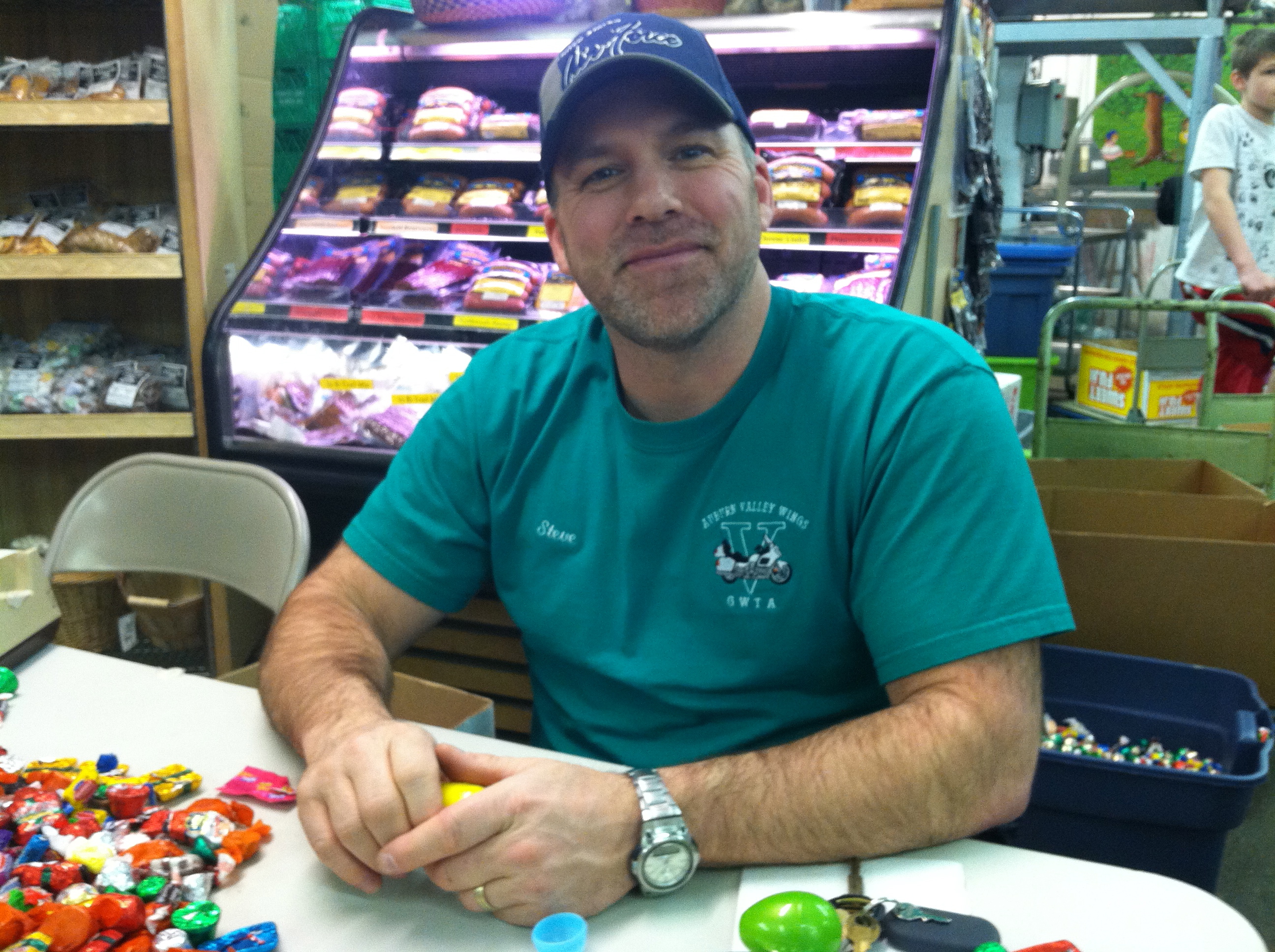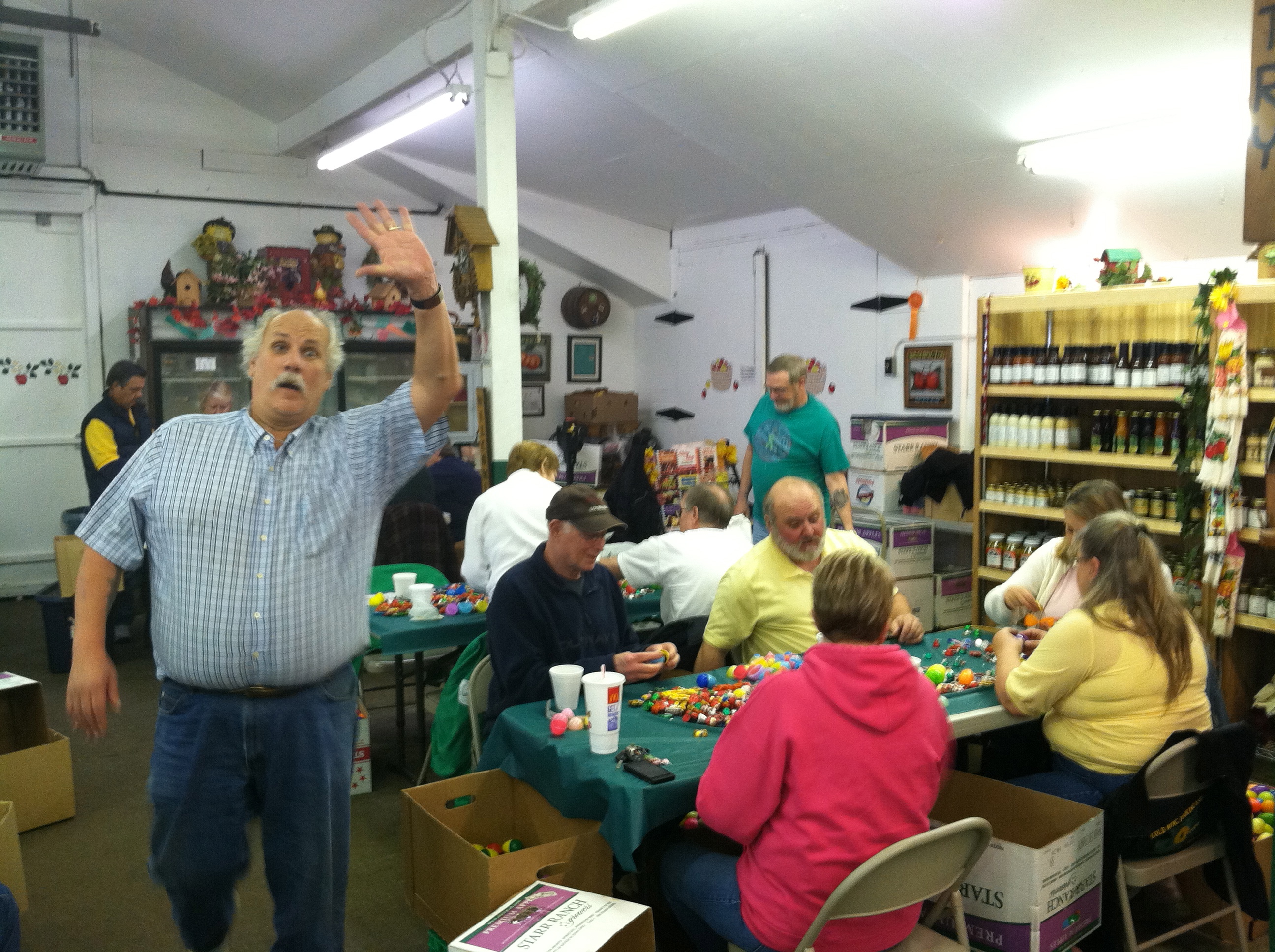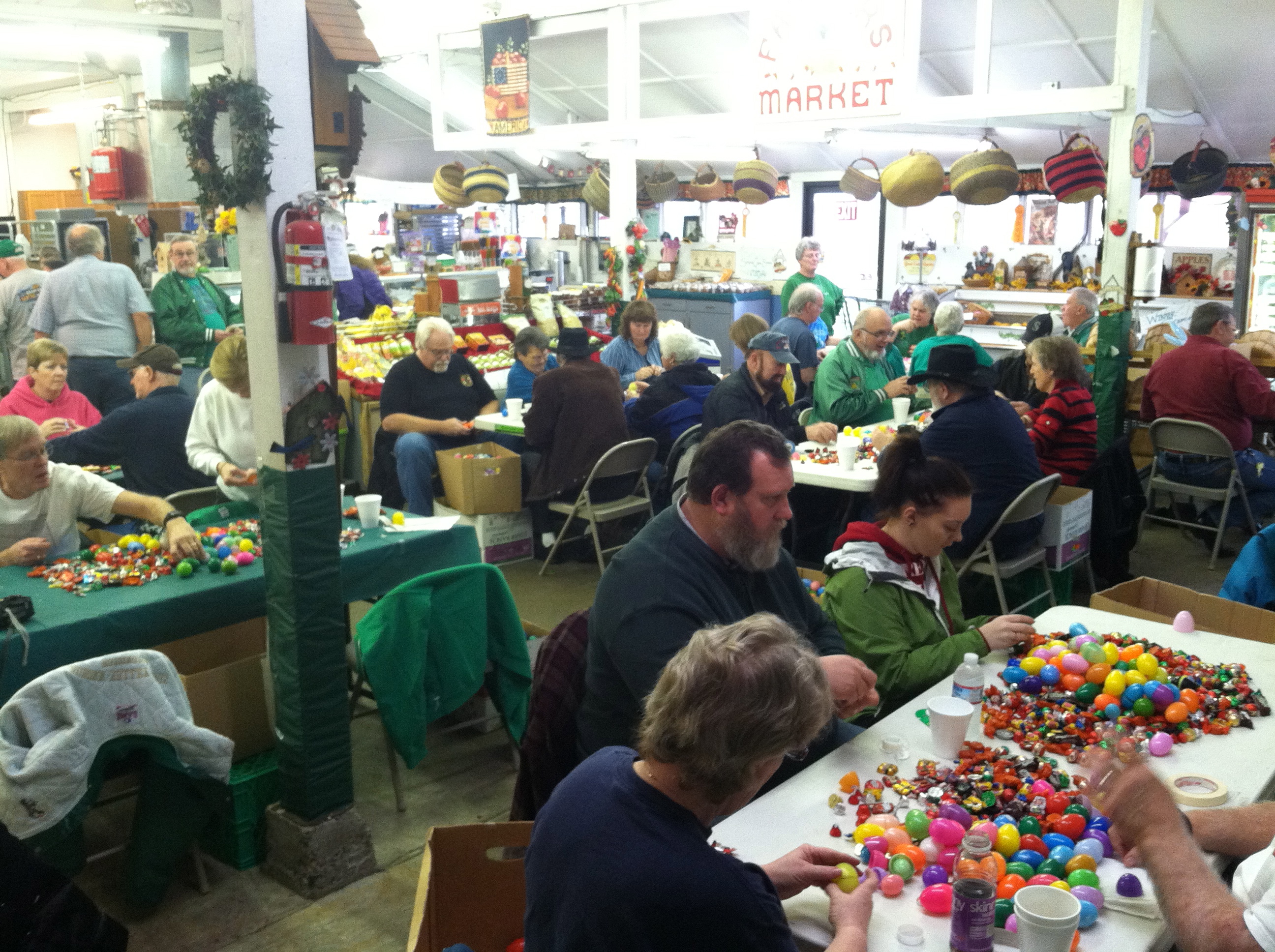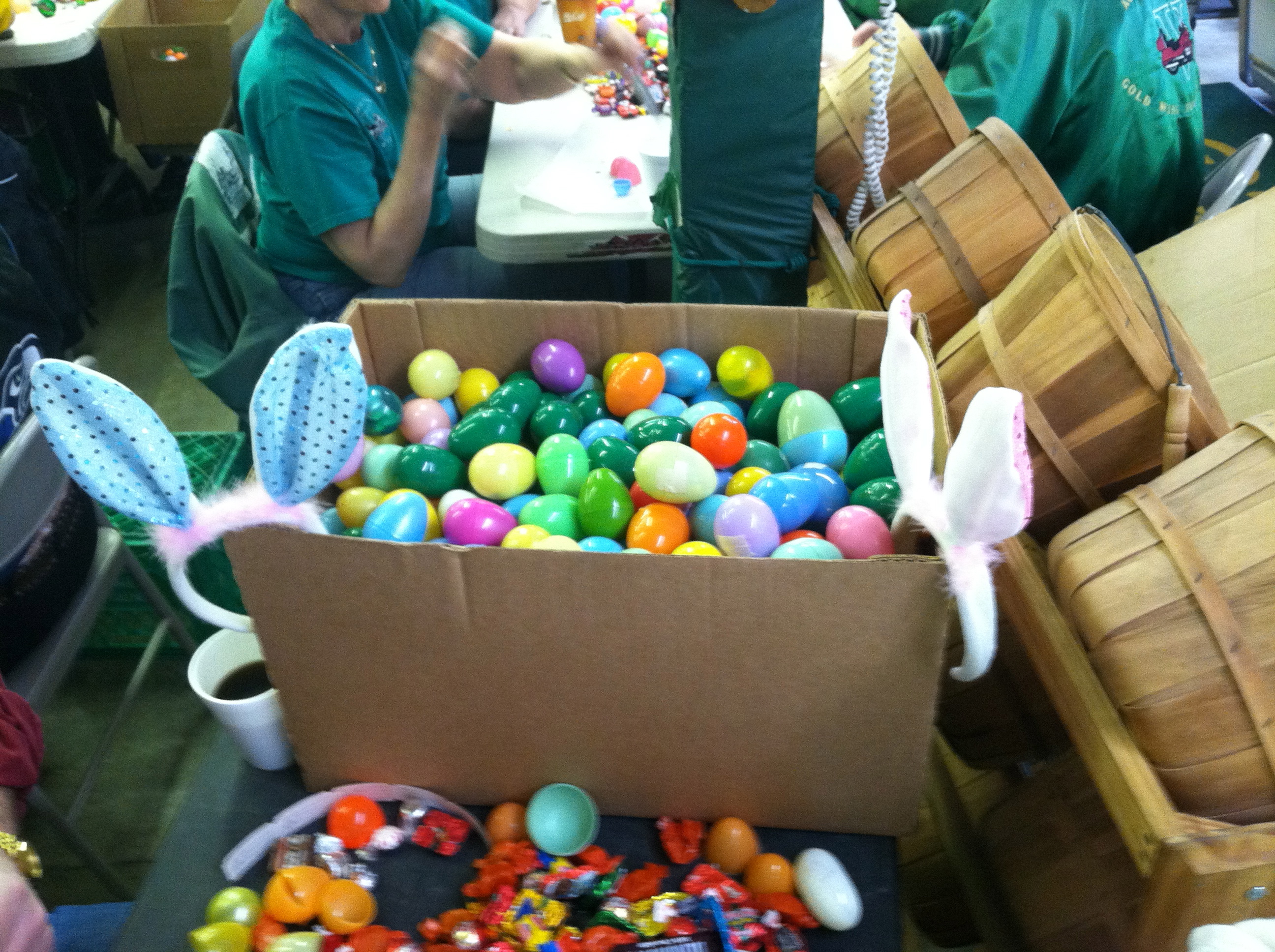 Talking to one of our table mates I discovered that the woman also worked for the VA, so that made for an easy ice breaker and from there it was just basic table talk and egg stuffing. Now I must admit there were times when we placed more than 2 pieces of candy in an egg but, hey, that’s the rebel in us I suppose. Shortly after we arrived, Lattin’s supplied us with their famous apple fritters and hot apple cider. Both were tasty and appreciated. A few more hours of stuffing and we were treated again with hot chicken and rice soup along with hot dogs, a favorite of mine at any event. Around 1pm our table decided to finish stuffing the remainder of our box of empty eggs then call it a day.