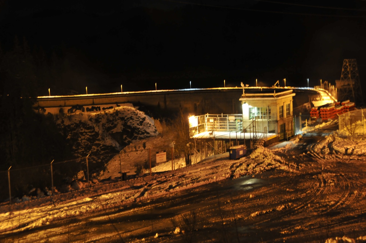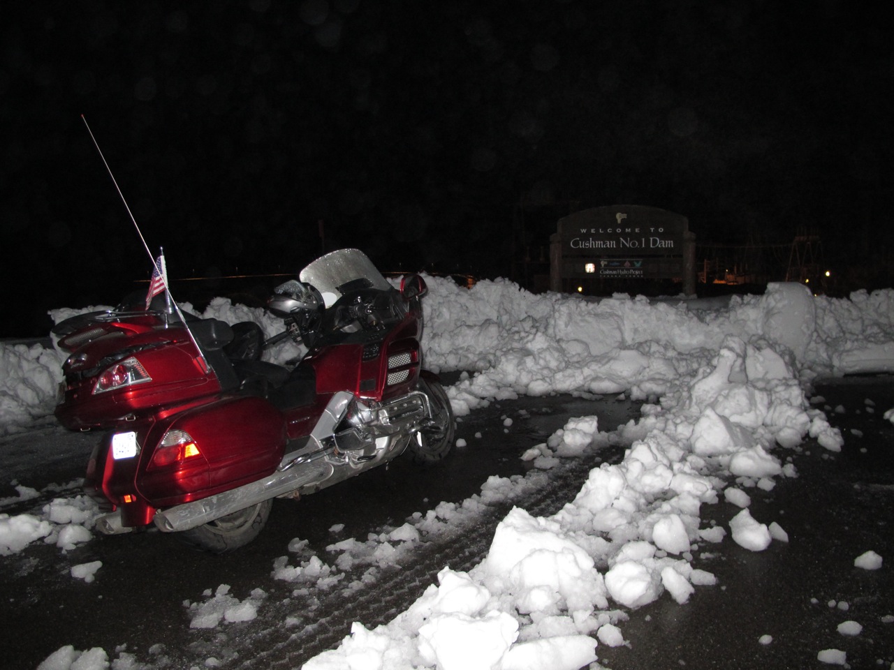 In preparation for our quest, the week before the start I did a test run with the camera on a tripod, setting the auto-timer to take pictures every five seconds and it worked like a charm. The evening of our trip we did another successful test, put fresh batteries in the flash, and prepared for rain with a second tripod to which we could ziptie an umbrella if needed. Before leaving that night, I logged into the atomic clock and set the camera to the exact second to make sure our picture would be as close to the correct time as humanly possible. Angela and I left about 10pm headed to our chosen dam, Lake Cushman Dam #1, located off Hwy 101 near Hoodsport, WA. I estimated we should arrive somewhere between 11:30 and 11:45 and was right as we approached our destination around 11:30pm. When we left Tacoma the weather was iffy, turning kinda ugly with snow flurries and big fat flakes coming down as we reached Hwy 101. I kept checking my weather temp reading and we were hovering around 35deg so I knew things were probably not going to stick. Not long after, the skies cleared a bit, the moon peeked its head out of the clouds and even a few stars were showing. The rest of the ride to the dam was uneventful as we enjoyed the crisp night air and the virtually traffic free highways. After arriving at the dam we took a few minutes to enjoy the beautiful evening and now completely clear sky. The previous day had provide about 4-6” of snow to the area but the roads were plowed and clear all the way to the dam so traveling them wasn’t a problem. As I was setting up the tripod, a security guard for the dam rolled up, a little inquisitive about our undertaking. I explained to him what DamTour is all about and why the heck we were there at 11:30 on a Wednesday night. He laughed, said good luck and went on his merry way. It was time to check the camera setting one last time before midnight rolled around. I had set the camera to take 40 pictures at 3 sec intervals starting at 11:59pm in hopes of catching our pictures as close to midnight as possible. So at 11:58 we got into position and waited for the timer to start shooting. At exactly 11:59pm the camera did just what it was suppose to do and we smiled for the camera until all the pictures were taken. Excited about the outcome I wanted to make sure the pictures had turned out, especially the one closest to midnight. As I was looking at the time stamp, I was mentally fist-pumping as I saw we had a caught a picture at 12:00:03am!! Perfect!! Then Angela quickly noticed that while the time was great, the date was completely WRONG! I was so focused on the correct time while setting the camera that I completely forgot to look at the date. So on the photo file it read 12:00:03 February, 02, 2011. OOPS! Not wanting to lose valuable time fiddling with the setting on a complicated digital camera, I went to the trunk and pulled out our travel camera and quickly fired off shots of Angela, then myself. Knowing not much time had elapsed I thought that maybe we still might get bragging rights, though I knew there were at least a half dozen other riders doing the same thing throughout Washington and Oregon. Looking at the camera information on the second camera I was delighted to see the time stamp was 01:06. Great! Just a minute past midnight so I thought to myself “cool, we may get this after all!”. But alas the digital gods raised their ugly heads again. I realized, it was not 12:01:07 as we had thought, but simply 1:07, as in one a.m. in the morning, a full hour after the start of the tour and the actual time that we were there. Last time I set this cameras information I forgot to check the little box that accounts for daylight saving time. DOH! Feeling like a heel I apologized to Angela, but after the fiasco(s) with Lake Lowell last year, she was quick to forgive! Although the second camera was the correct date, if not time, we held out hope that others hadn’t made the dams of choice and that our picture might still be good enough to capture the first dam of the season. After all, last season we got first dam with a photo taken at 6:51 in the morning. We packed up and headed home.