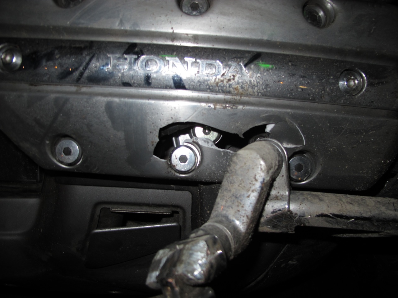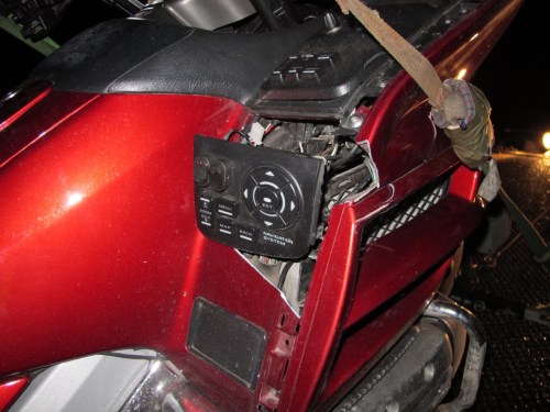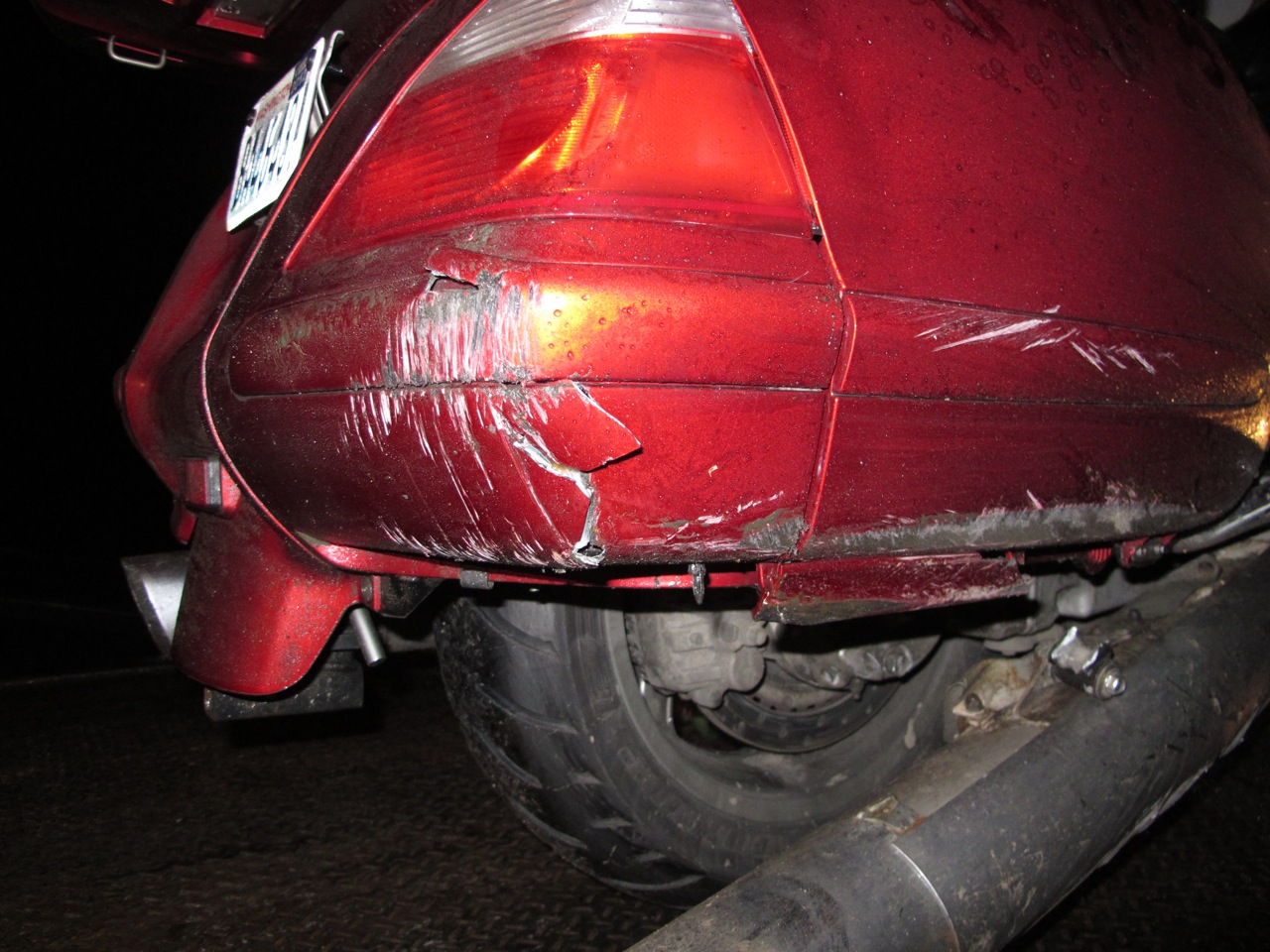 Here’s where the story turns a little ugly. The night was still quiet and clear and the temperature had dropped a few degrees but my temp gauge was still registering 34 deg. So I eased back down the access road leading from the dam site until hitting Hwy 101. Seeing runoff water from the snow pack I was confident the roads were safe enough for travel and down Hwy 101 we went. Continuing to check the brakes and for signs of ice, the miles quickly clicked by without trouble. Taking the onramp from 101 to I-5 I thought the front end felt a little squirmy and that there may have been a little ice due to it being an overpass. Slowing down and keeping a keen eye on the road we safely merged onto I-5 without incident. This was, however, about to change. A few more miles down the road I-5 showed no signs of trouble or previous snow fall but still I tucked in behind a semi and kept the speed down. It was about 1:30am so the majority of the vehicles were truckers. I eventually passed the semi by slowly increasing my speed until I was safely past it, then stayed in the second to the right lane. After a few more minutes I knew we were coming to the Nisqually Valley and it may have the potential for ice. Starting to traverse into the valley I signaled for the right lane which I knew had the best chance of being clear due to all the trucks using that lane. This is where things get a little fuzzy…I don’t know how long after I changed lanes that we hit a patch of black ice. The things I do remember haunt me every time I think of them. As soon as we hit the black ice, the front end started to shimmy and in mere seconds we were down and sliding along I-5. The impact for me wasn’t very severe, but I do remember, as I was sliding and sparks were flying everywhere, that I caught sight of Angela sliding down the center of the right lane. I must have been spinning because I lost sight of her and didn’t see her again until the bike stopped and came to rest on the shoulder of the road. My foot was trapped beneath the bike and, along with my beautiful bike, I slid for what seemed an eternity. As it turned out, Angela was almost immediately off the bike and sliding on her left side. Without the bike carrying her along, she came to a quicker stop than me and crawled across the lane to the shoulder. As luck, and the hand of God would have it, myself, Angela, and the wing all made it safely off the roadway. The last few yards of sliding the bike made a turn and released my foot. The bike and myself ended up about 50 feet from Angela. Not even knowing if I was hurt, as soon as I stopped I jumped up, threw off my helmet and started running towards Angela. Knowing my concern, although still on her hands and knees, she was waving and yelling “I’m alright, I’m alright”. Quickly gaining my senses I realized we needed to get on the other side of the guard rail because others may hit the black ice and come veering towards us. Plus, with the bike on its side and facing the wrong way and all the lights still on it may confuse others and they may panic and swerve. After retreating to the other side of the guard rail we quickly started to access our injuries. After a few brief moments, we realized we weren’t severely hurt and our attention turned to emergency help. I always travel with a SPOT GPS satellite messenger device. The SPOT had come out of my pocket but ended up resting against a guard rail post. Seeing the device I activated the distress button to summon help. After sending for help, my attention quickly turned to my beautiful, precious bike. Yes, it had come to rest on the shoulder but it was still too close to the fog line for my comfort. We found the emergency flares and put them out along the fog line, along with an emergency strobe. I don’t know how Angela and I did it but we seemed to pick up the damaged bike with little effort. Can you say adrenaline? After righting the bike I was able to back the bike to alongside the guardrail, hopefully out of harms way. Shortly after moving the bike, to our delight 3 sheriff cruisers came over the horizon towards us. It was less that 5 minutes after activating the SPOT that authorities were on site. After a few standard questions to make sure we were okay the process of getting everything and everyone to safety began unfolding. The officers called and arranged for AAA to tow our bike, and calls were made and statements taken, Angela stayed in the back of one the cruisers to keep warm and safe. I, however, started to access the damage to the wing. The most noticeable was the huge puddle of oil. My highway peg on the right side had punctured a hole on impact into the right side crankcase. The right side muffler was destroyed along with a good chunk of the rear saddlebag. Both mirrors were damaged along with the right brake lever. Also, along the right side was damage to the controls for the onboard navigation. Other than the crankcase, everything else looked cosmetic. If I had to classify the incident, I would say it was a textbook slide accident. We believe the icy road that caused us to go down actually prevented us from harm by keeping us sliding on a thin layer of ice rather than tumbling on rough, bare pavement. And, other than a few bruises and sore muscles, we are absolutely fine. One of the officers took Angela to a Chevron in Dupont where she waited for a ride from some close friends we called and asked for help. Shout out to Aaron – it’s a good friend that will get out of bed at 2:30 in the morning to give you a ride. I stayed behind with another officer who was kind enough to let me sit in his cruiser until the tow truck arrived. While waiting in the cruiser, nearby two vehicles spun out in the southbound lanes and veered off the road with one of them landing on its roof. Hearing the police chatter on the officers radio it seemed that, although shook up, all passengers and drivers were okay. I guess Nisqually Valley reeked havoc on more tha