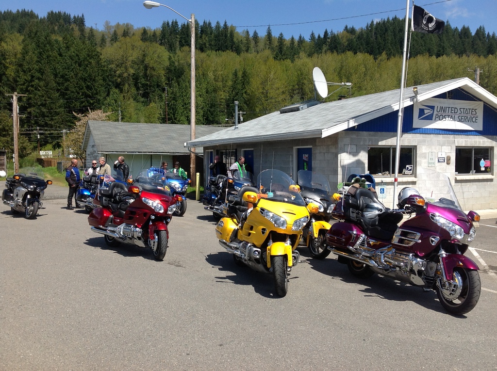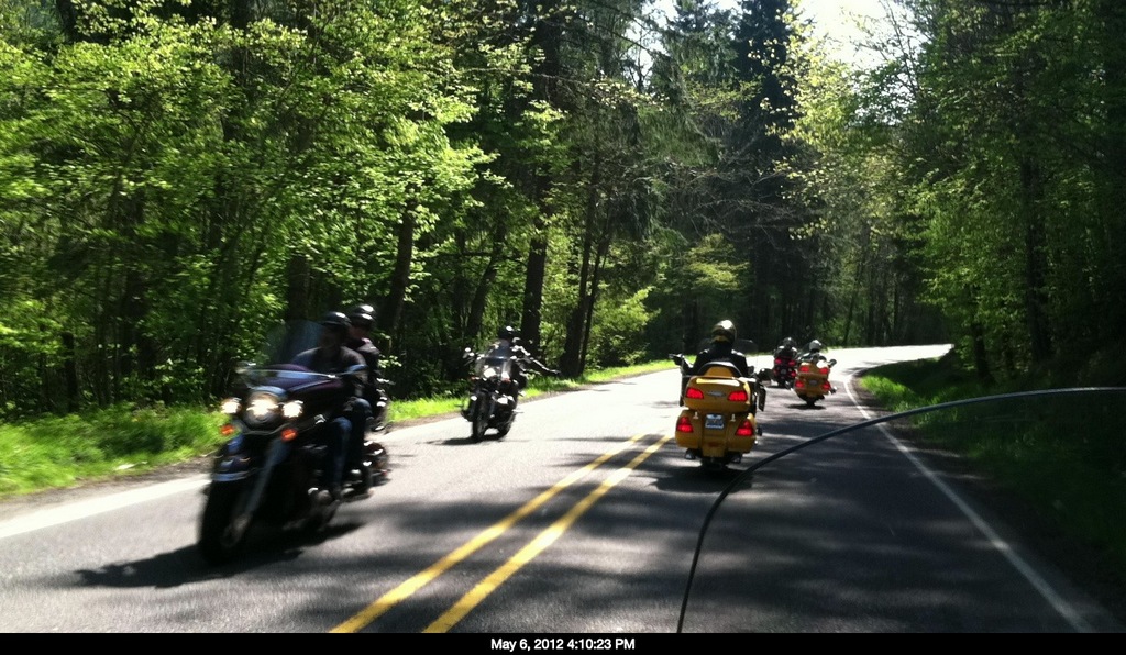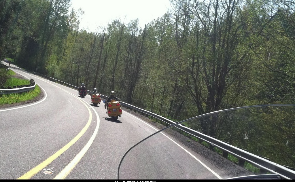 For the first time since February, we were able to attend a chapter meeting on the Wing.  We celebrated by joining in on a post-meeting ride, the first in which we’ve ever participated. After the meeting, those that wanted to ride stood around the parking lot tossing out ideas of where to go, looking up nearby Wing Washington locations and, after a little deliberation, someone mentioned Skate Creek Road. Most of us have ridden up or down this road several times and know that, while it can be a beautiful ride along the creek and through the forest along a curvy road, it’s a road that can be closed well into spring. Angela, with her trusty new iPad, looked up the National Forest Service website and found that the road was open. With this new information, the group quickly agreed that this would be our quest for the day. Our ride leaders, Ron and Margaret Silverman, easily determined a route and once everyone mounted up, a group of nine bikes set out through Puyallup to I-5.