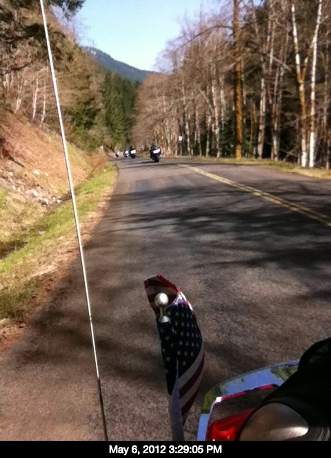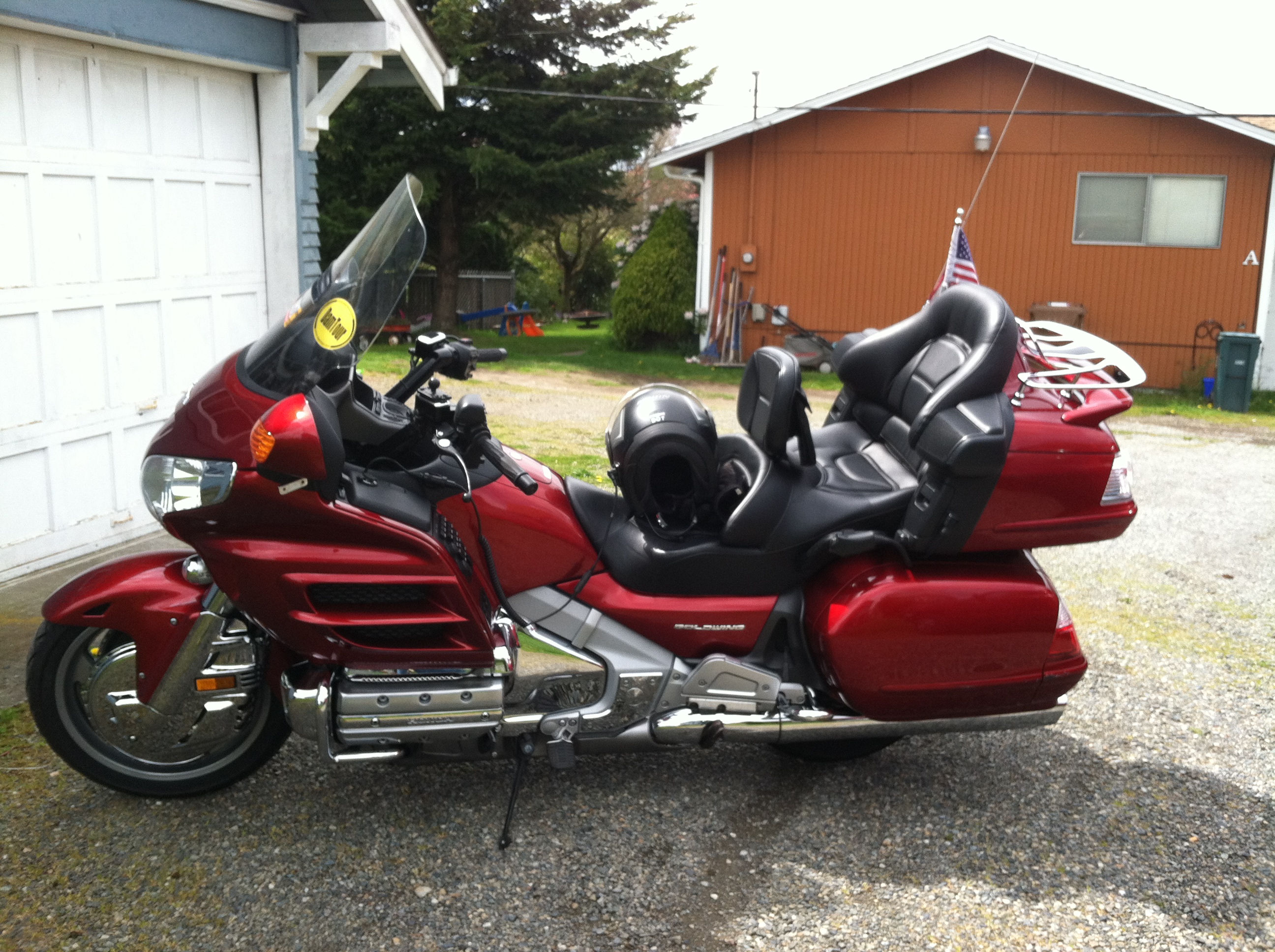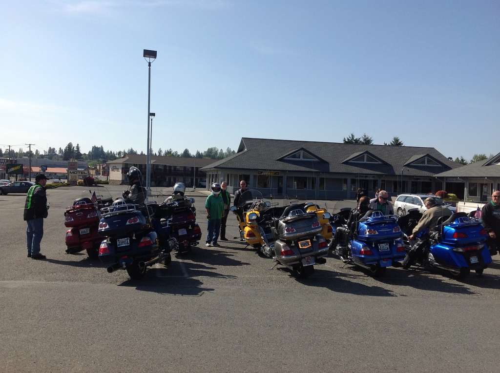 Gary, for almost a year now, has been talking to me about Hyper Pro progressive shocks for our wing. Seizing a great opportunity, Gary offered to switch bikes so we could ride his for comparison. Once the group started heading out of town Gary and ourselves split from the crowd to head towards Tacoma. We rode Gary’s bike from Eatonville to the 224th & Pac Hwy intersection. I had  to admit the bike seemed more responsive and definitely a lot smoother. Angela also said she noticed a difference in the ride. She mentioned the bumps seemed smoother with less jolt and sharpness to them. So, when the budget allows, I will definitely be spending a day at Vonda and Gary’s house for an upgrade to my suspension. After a brief discussion with Gary, we switched back to our own bikes and parted company. Angela and I headed towards home through town which was boring but uneventful and the weather sure made the trip a lot easier to tolerate. We made a short detour to moms to drop off some paperwork and while there a couple friends of the family were admiring the bike and asking about all the switches. I took a few minutes to proudly show off the wing and explain the joys of riding and how easy a wing is to ride. After our detour we were home by 6 and fully satisfied with our day.  It was a beautiful day for a ride, and it was so nice that we didn’t have to think about the route or keep an eye out for where to turn; all that we needed to do was follow the taillights in front of us. It was our first after-meeting ride and the weather made for a very mellow day and a great second start to our riding season. Thank you Ron and Margaret for your guidance, and thank you other GWTA Chapter V members for the friendship. Tonight I’ll lay my head on the pillow with a smile on my face and many happy thoughts of the day swirling in my head. Until next time, keep the rubber side down.