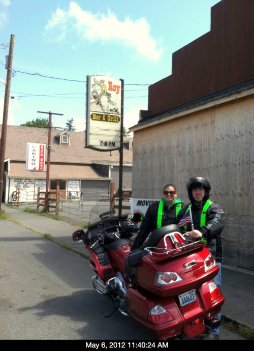 We took Spanaway Loop and headed out to Roy where the group stopped to allow Angela and I to take our Wing WA photo outside the Roy Bar and Grill (Boy’s Name Town)