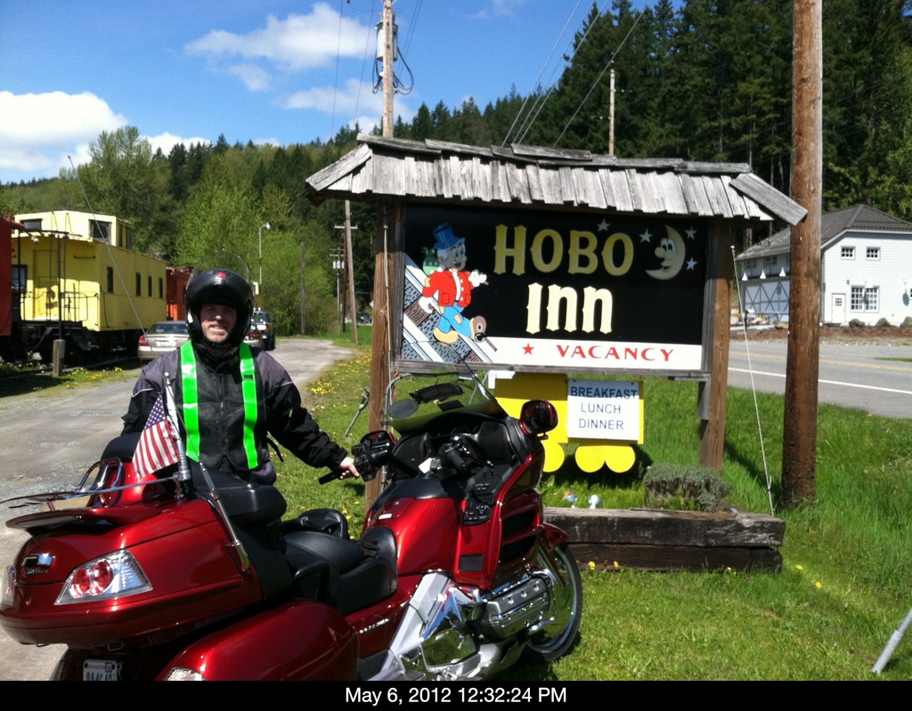Jennifer handed out cookies she bought in Roy (yummy – thanks Jennifer :-)) and, while the others bs’d, we and the Silvermans, rode across the street and took pictures for a Wing WA bonus at the Hobo Inn (Interesting, Creative Lodging).