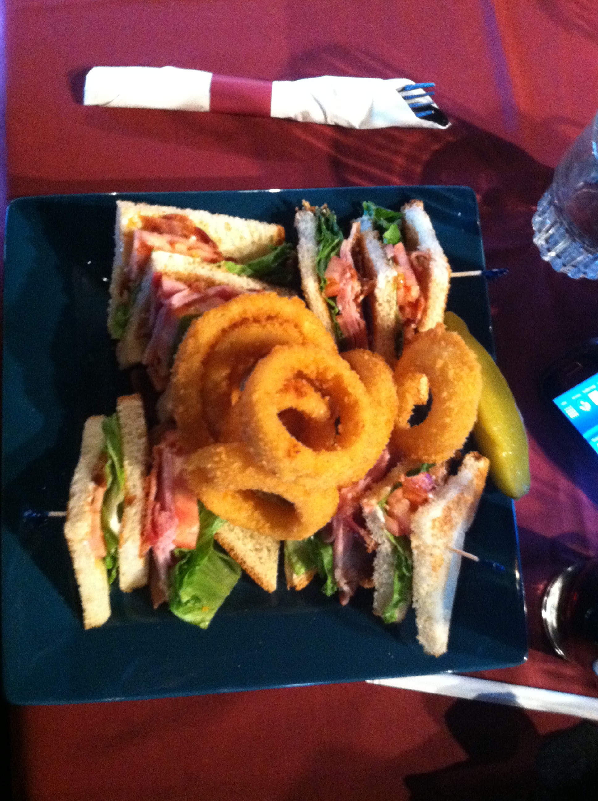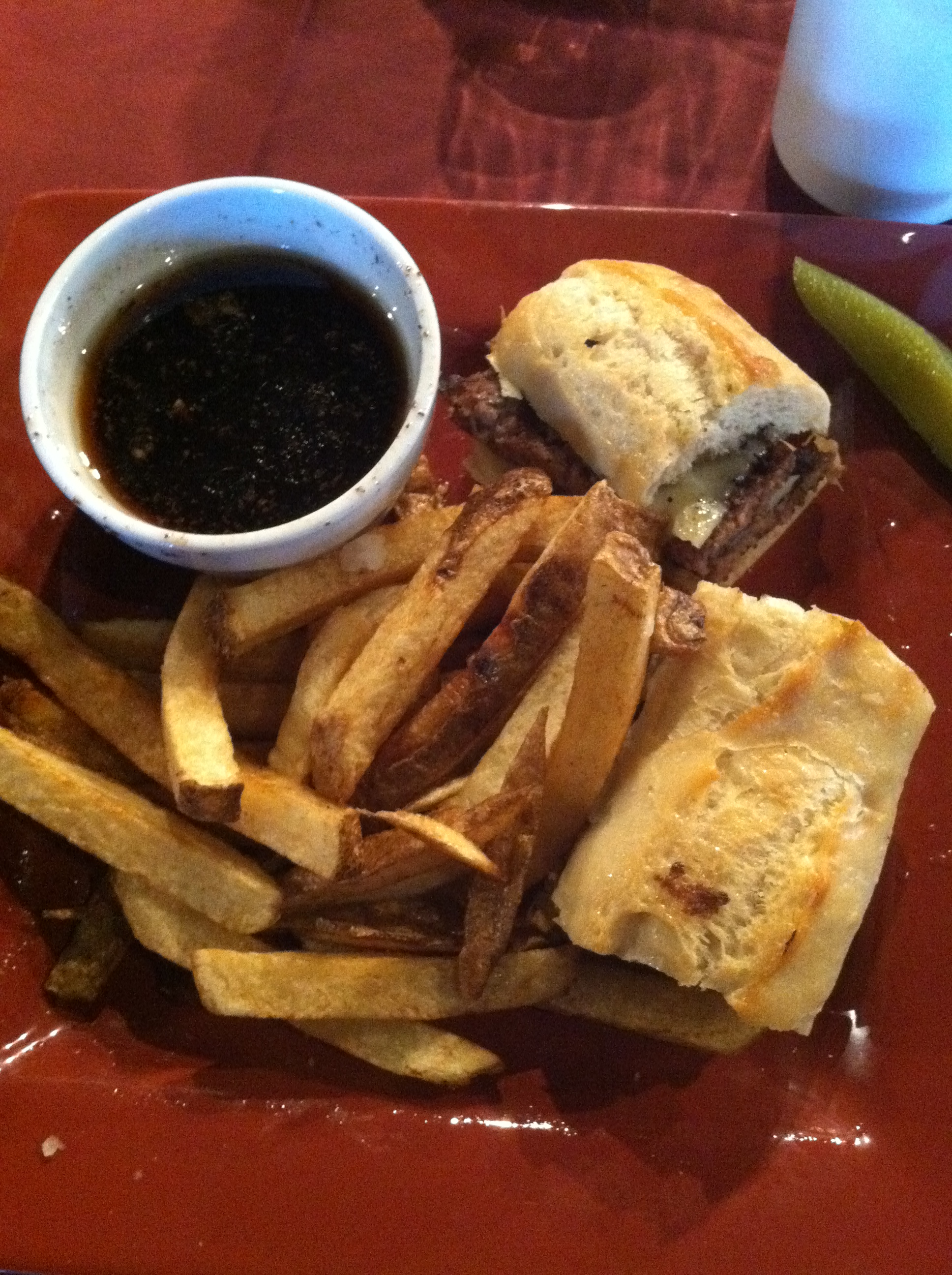 They did well getting drink orders, eventually just leaving pots of coffee on the table for us to serve ourselves :-).  Even though there were a ton of us, they let us order with separate checks, working their way around the table noting names and orders as they went.  And, as is our norm when we have a big group, we told them to just send out the food as it was ready rather than trying to make them serve all of us at once.  Steve had his standard, a club, while I tried their burger dip.