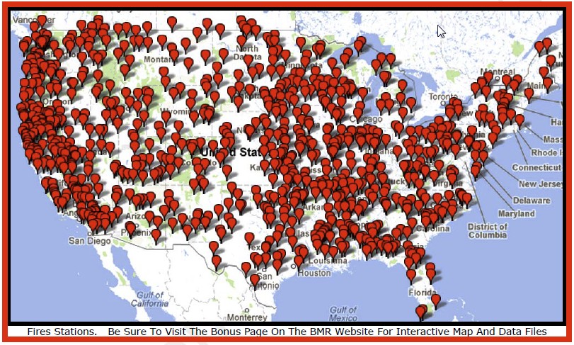 Fire Stations (2 pts each) – While there are about 73,000 fire depts and/or stations across the U.S. , they’ve given us a list of 827 to choose from.  Here’s what that looks like: