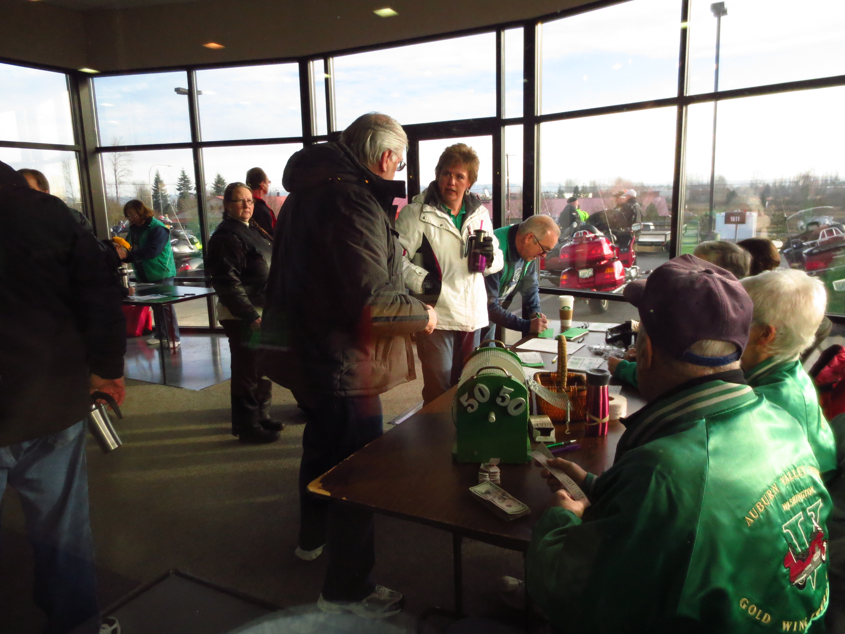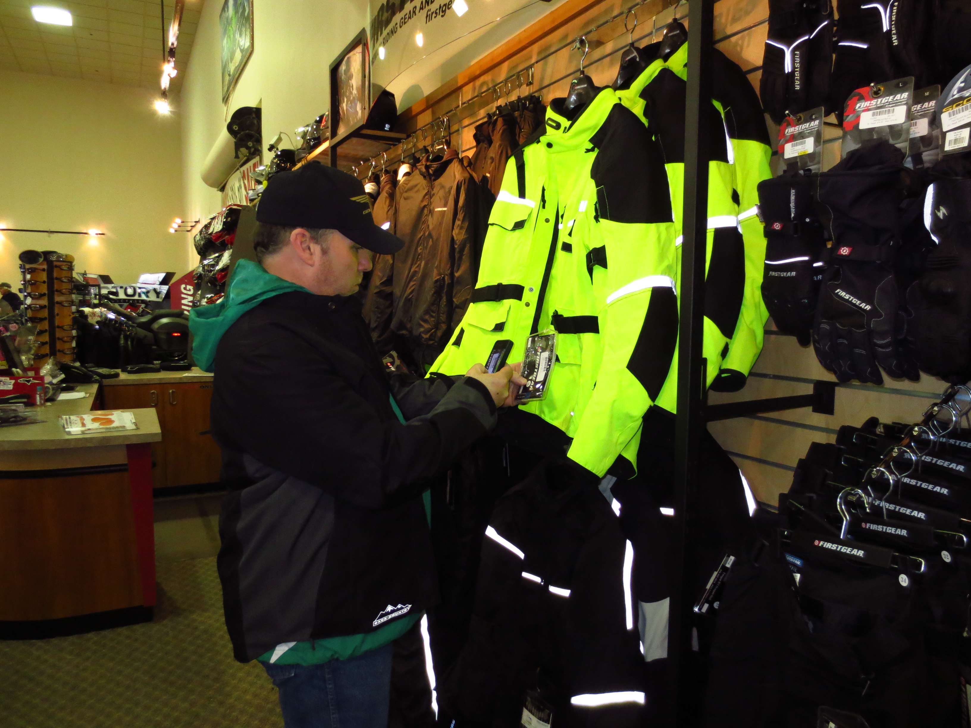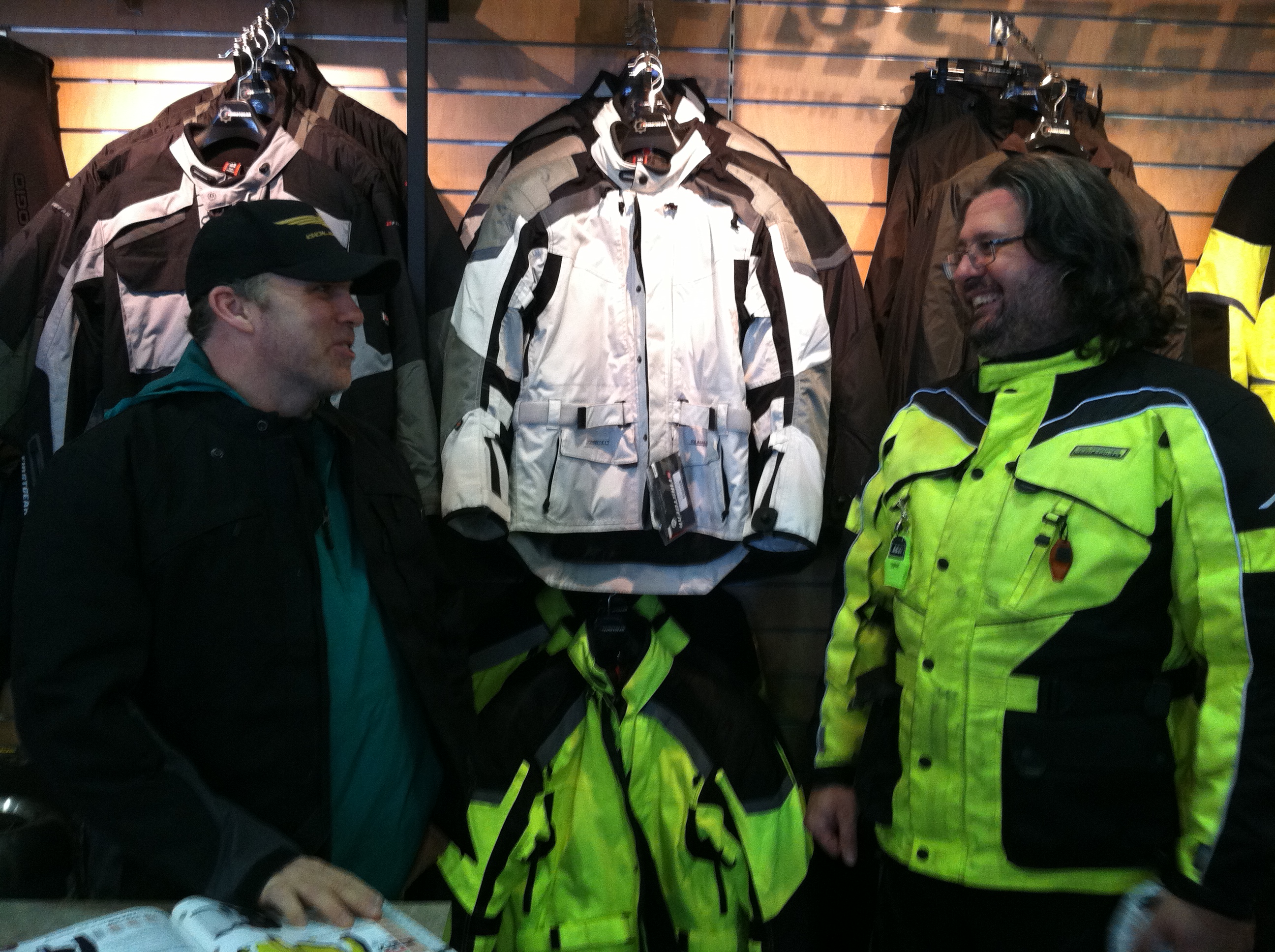 Necessary business taken care of, we stood around chatting then spent a good deal of time trying on jackets. There are now far more options available for jackets in the bright and see-able safety yellow color and we each found one we liked.