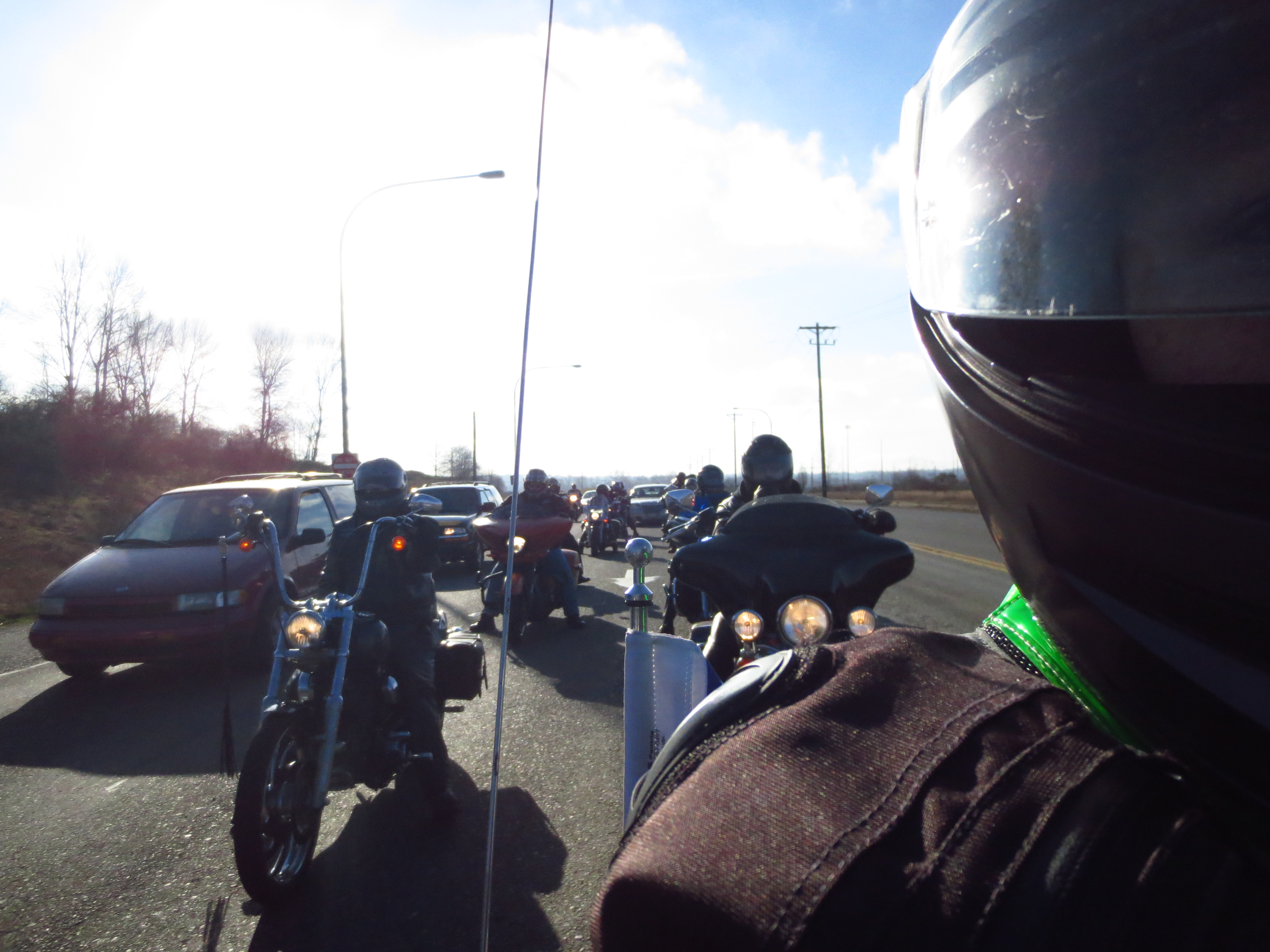 As we walked out the doors, one of our chapter members busy selling raffle tickets asked if we were going on the ride as there was a gentleman looking for someone to follow. We said sure, introduced ourselves, and he said it would be just a few minutes as a couple buddies had gone to fill up their tanks. We mounted up and shortly he came over and said they were ready. As we pulled out of our spot and waited for him and his friends to line up behind us, we were shocked to find it was a large group from the riding club Twisted Riderz of Seattle (http://www.twistedriderz.com). We weren’t just leading 2-3 bikes, but rather about a dozen! Luckily, we had looked over the ride instructions and knew it was all familiar territory. We headed out from Hinshaw’s, down to Sumner, through Puyallup, skirted around JBLM through Lakewood and down to Steilacoom, through University Place, over to Ruston and the waterfront, onto 509, then up Norpoint Way to Jimmy Mac’s in Federal Way.