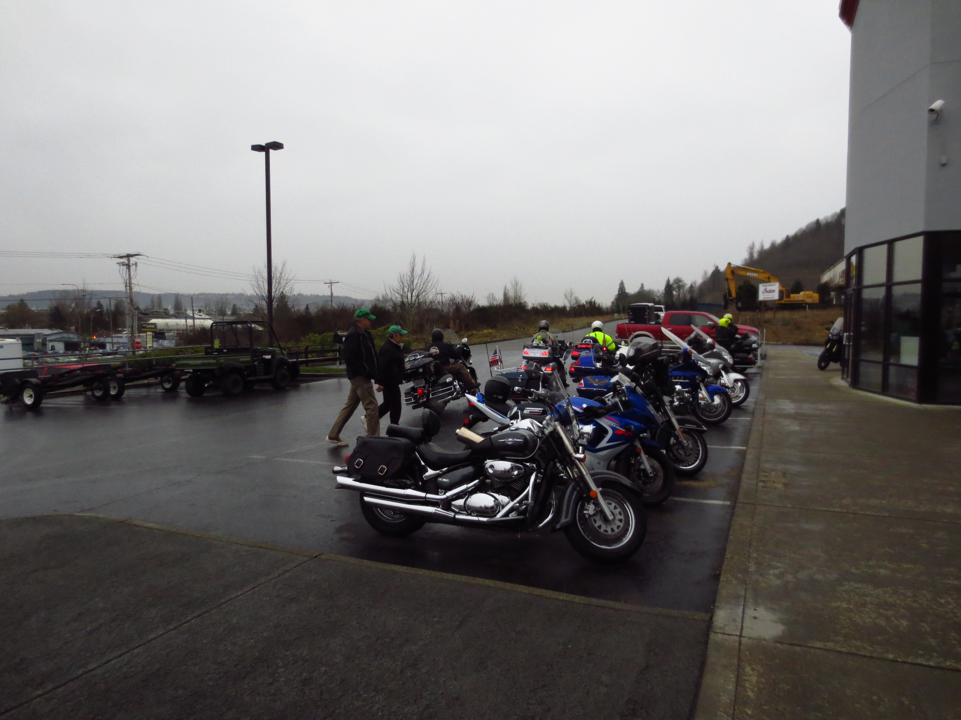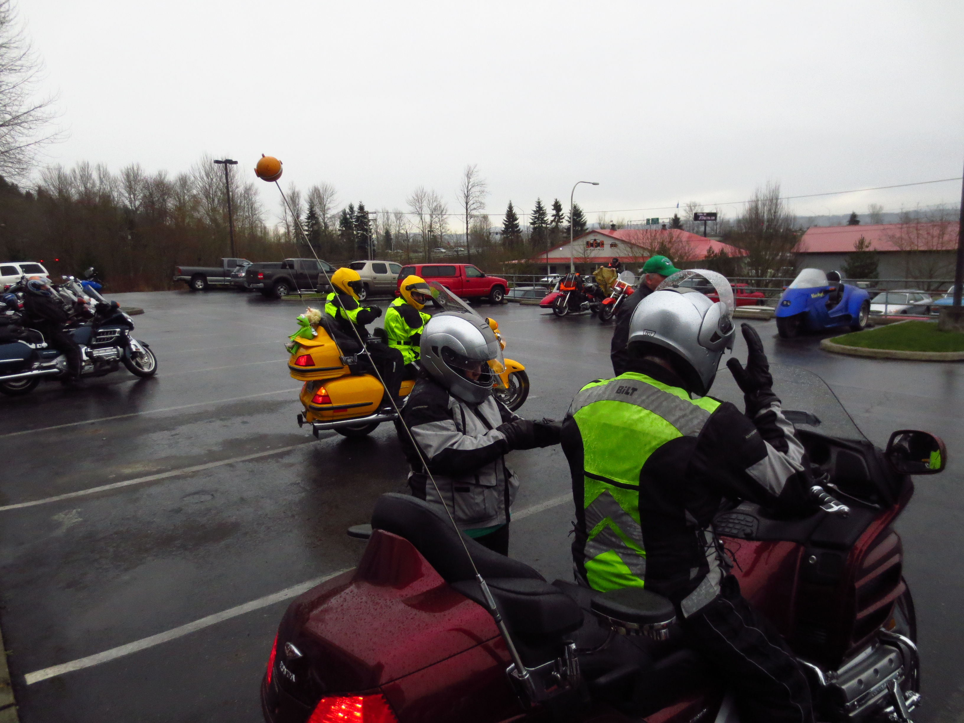 Overall, it went pretty well but there were a few wrong turns. And missed turns :-). First, somewhere in Bonney Lake, I turned a street before I was supposed to and ended up on a small neighborhood road. Much to my relief, it was wide enough that I was able to u-turn right in the street, and the row of bikes followed us. This is how Angela was able to count and find out there were 11 of them behind us. Second, in Federal Way, Angela warned me of an upcoming unmarked Y where we were supposed to go right. I thought I knew the intersection – I was wrong. I went straight instead of making the right. We quickly figured out my error and, luckily, there was an empty parking lot just up on our right. We pulled over to confer with Paul, who, thankfully, knew the area and we realized we had only missed a small side route and were actually facing the street we would have come out on anyway. We made the turn onto Hwy 99 and continued on our way, getting back on track within a mile or so. By this point my directions had been reduced to about a 4 inch square, stuck to the back of Steve’s jacket with just enough visible to get us through the end of the ride. With only two more turns until the end of the route, I breathed a sigh of relief. Then we missed the next to last turn and were completely lost. We had no knowledge of the area we were in and no idea of where to go or how to correct ourselves. Luckily, someone in the group did and, even more luckily, they had a CB. Turn by turn, they told Paul, Paul told us, and we were able to make it to the restaurant. Everyone was wet but in good spirits.